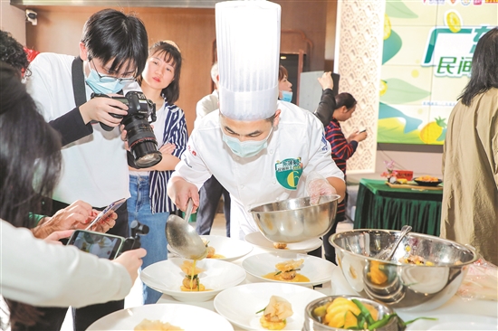 菠萝手撕鸡、凤梨大鳝球、酥炸春卷花配菠萝汁、一菠三味……4月10日下午,由广东省农业农村厅主办的“广东菠萝民间厨王擂台赛”总决赛在广东省乡村振兴文化服务产业园举行,9位来自民间的烹饪高手大展厨技,展开了精彩比拼。这是2021广东菠萝“12221”品牌推广营销行动系列活动之一,将“粤菜师傅”文化与广东特色农产品相结合,进一步擦亮“粤字号”农产品的金色招牌。