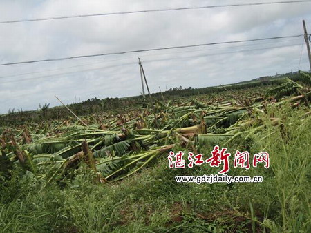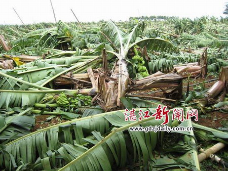 近日,笔者乘车在徐闻县乡镇公路上看到,沿途田野里的农作物不同程度受灾,特别是香蕉园一片狼藉不堪,有的香蕉树被风刮倒,有的被拦腰折断,有的被打得歪歪斜斜。笔者来到徐闻县和安镇一农户的香蕉园看到,30亩已打了竹桩扶住的香蕉几乎全部被风从树头刮倒,幸存的100多棵香蕉也已严重扭伤几乎残废。据园主介绍,这30亩香蕉眼看着这个月底就可以上市了,不想到一下子被台风全面摧毁了,真让人心痛,到目前为止,直接经济损失达15万,如果按照目前香蕉市场收购价计算,间接经济损失达35万元。