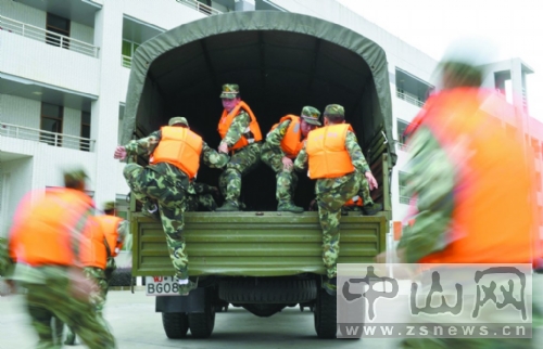 日前,广东中山边防支队出动50名官兵和近百套抢险器材,开展以紧急转移群众、加固堤坝、海上遇险搜救、伤员运送等为主要内容的防风防汛演练。 记者余兆宇通讯员李松林梁华摄
