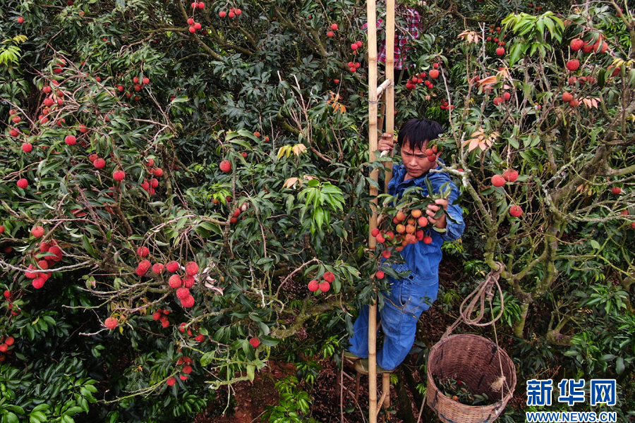 资料图:2020年5月,在广东茂名高州市根子镇,果农爬上枝头采摘荔枝。新华社记者 邓华 摄