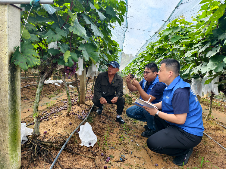 保险公司理赔团队查勘果园受灾情况。