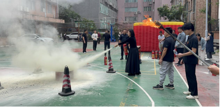 随后,在厅机关大院篮球场开展的实战演练环节中,参演人员依次体验了模拟火场逃生安全屋、防烟面罩佩戴、灭火器实操使用等科目,全过程紧张有序、操作规范,有效检验并提升了干部职工应对突发火情的自救互救能力。